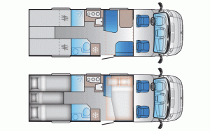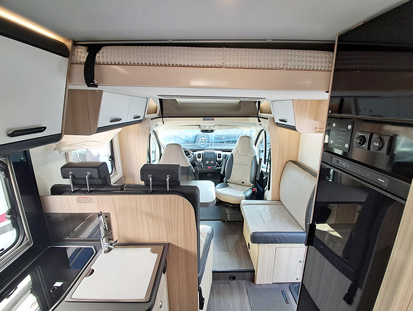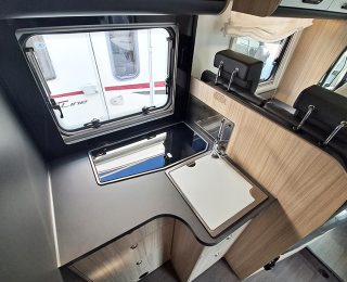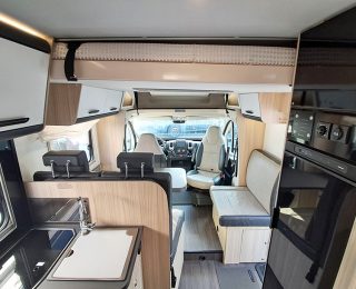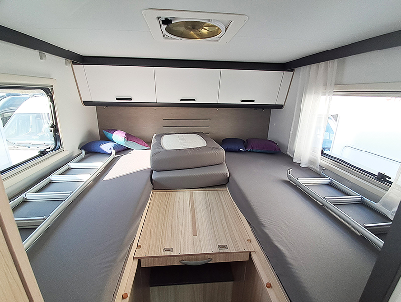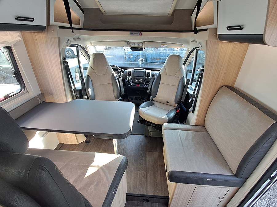 De camper heeft vier zitplaatsen voor het rijden en 4 slaapplaatsen. Hij is voorzien van twee losse bedden (2.10 m x 0,85 m) met middenstuk (1.90 x 0.60). Met elkaar te verbinden tot een kingsize bed. En er is nog een hefbed (1.25 m x 1.90 m).